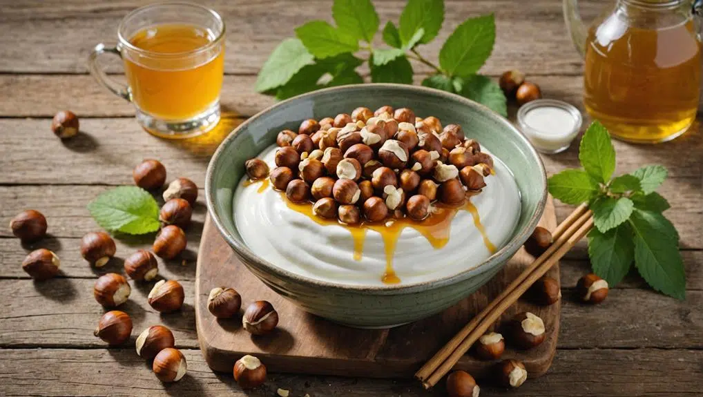 Before incorporating them into the yogurt mixture, roasted hazelnuts must be properly prepared to enhance their flavor and texture. Roasting is a key hazelnut processing step that intensifies the nut's natural oils, bringing out a richer, more robust flavor. Understanding the roasting technique is vital. Typically, hazelnuts are roasted in an oven at 350°F for about 10-15 minutes, or until they begin to brown slightly and the skins crack. It's important to stir them occasionally to guarantee even roasting.